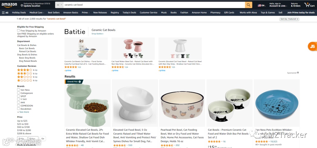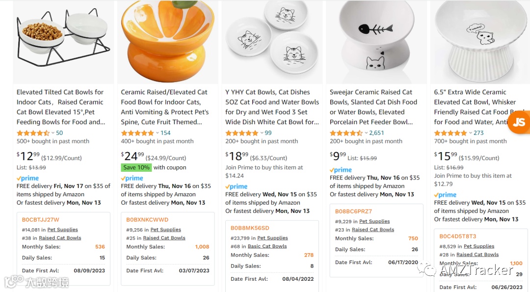 通过前台搜索关键词(如"ceramic pet bowl")寻找潜在产品。重点关注上市时间在一年内、销量超过10个、价格在20美元以上且具创意性的款式。观察BSR排名和前10页的产品表现,筛选出具备竞争力的潜力款。
