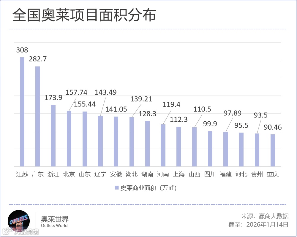 面积对比来看,福建10个奥莱项目总商业体量97.89万平方米,排名第14位,不仅与江苏(308万㎡)、广东(282.7万㎡)有量级差距,也低于辽宁、安徽、湖北、湖南等省份。
