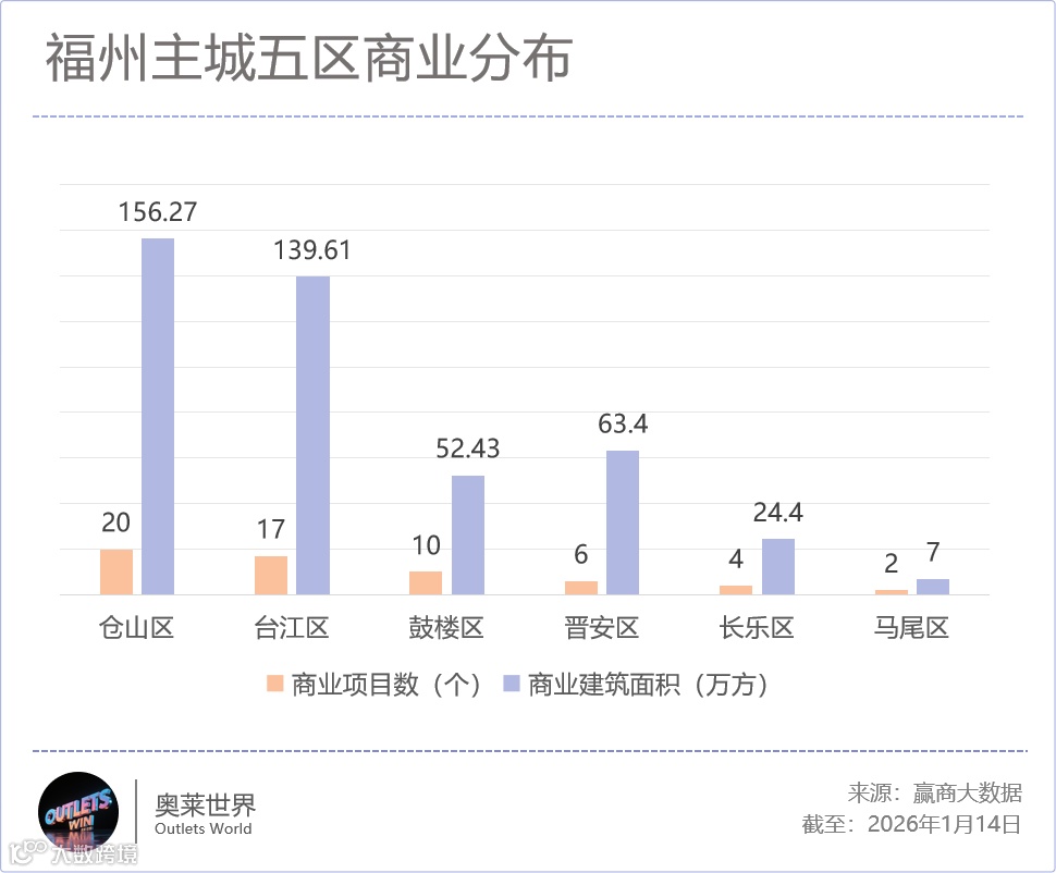 赢商大数据显示,福州主城五区59个集中式商业项目中,“商业最强区”仓山区独占20个,聚集了全国销售额靠前的仓山万达、爆红非标项目烟台山商业漫步街区、远洋德呈乐堤港,以及预计2027年开业的SM福州仓山城市广场等标杆项目。