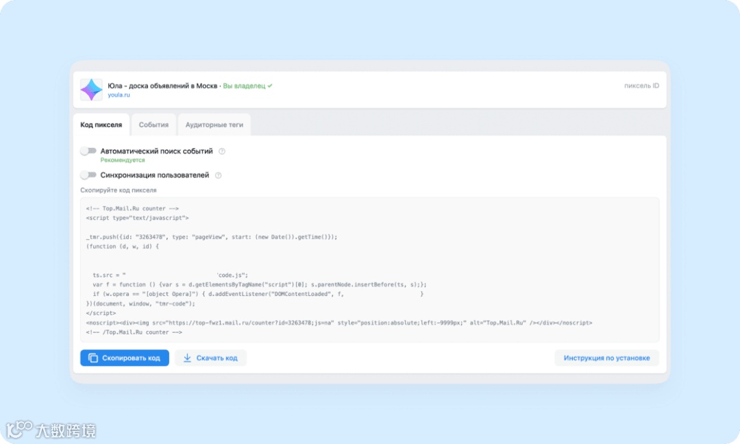 为了让VK广告像素传输有关用户的信息,卖家需要将其添加到网站并设置跟踪事件。