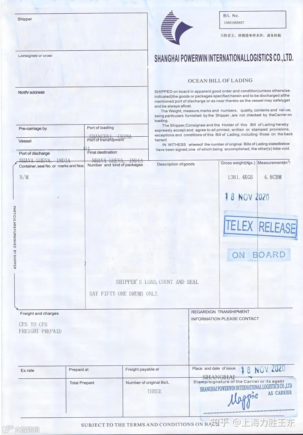 电放提单(Telex Release Bill of Lading)