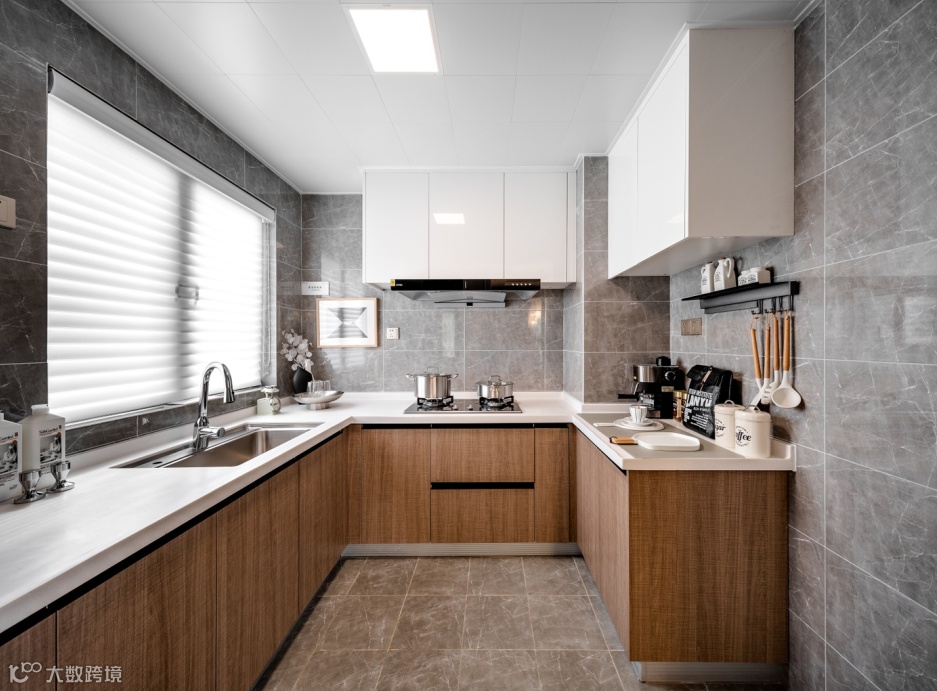 厨房流畅动线布局,科学操作平台,人体工程学设计,洗、切、炒加速美味传递。墙面装上吊柜,将空间利用最大化,享受烹饪的乐趣。