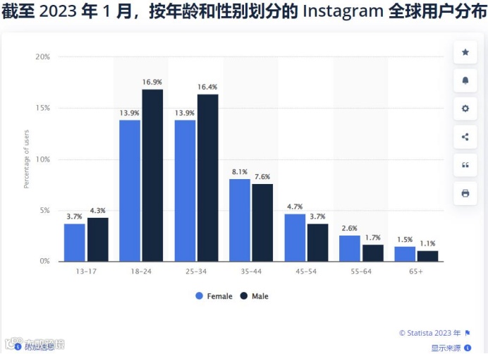 根据Statista数据显示,截至2023年1月,全球超过一半的 Instagram 用户年龄在 34 岁或以下,大约 16.9% 用户是 18 至 24 岁的男性。