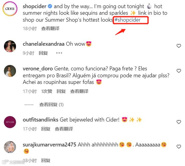 Cider发布的帖子一般都会添加“#shopcider”、“cidergang”等品牌标签,为品牌吸引潜在客户。