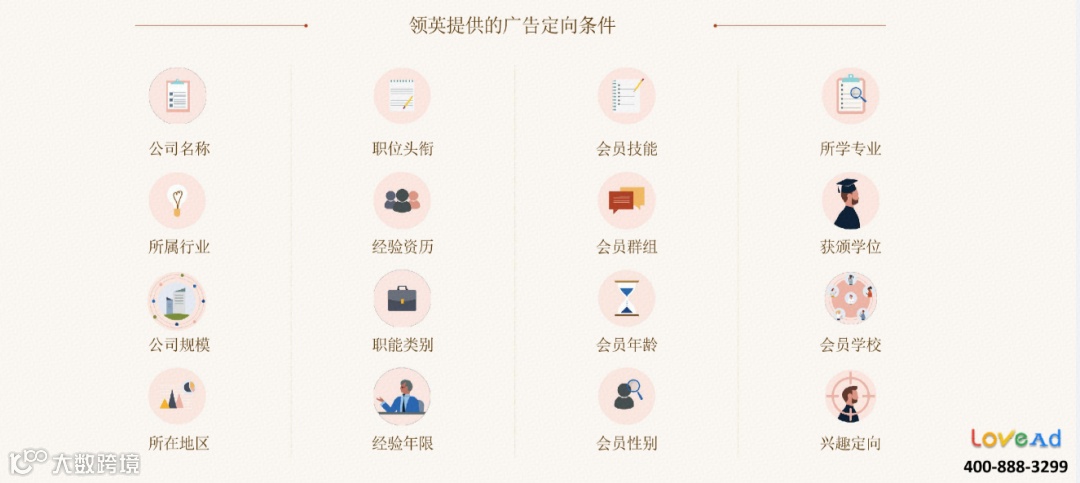 领英平台推广的优点之一在于超牛的定向功能,可以根据职业、职位、行业、公司规模、兴趣、学历、技能、地区等因素,筛选出特定的用户,减少非必要点击,提高效率,节约成本。