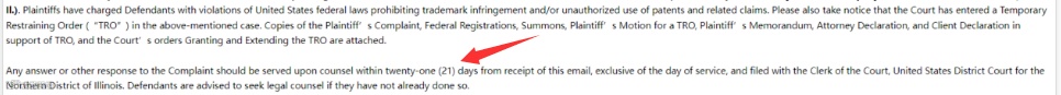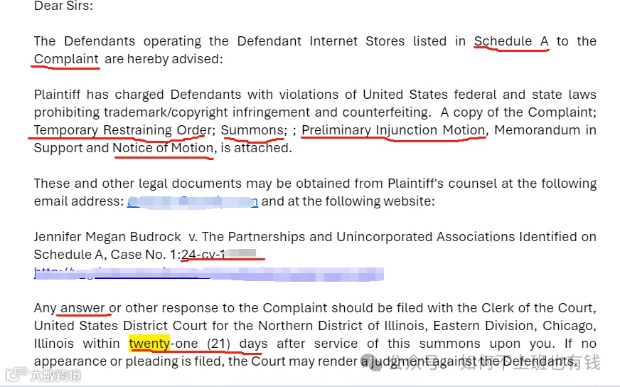 - 识别关键词:Schedule A、Complaint、Temporary Restraining Order、Summons、Preliminary Injunction Motion、NOTICE of Motion、24-cv-xxxxx(替换为自己的案件号)、twenty-one days、Answer、TRO等(可通过邮箱搜索确认)。