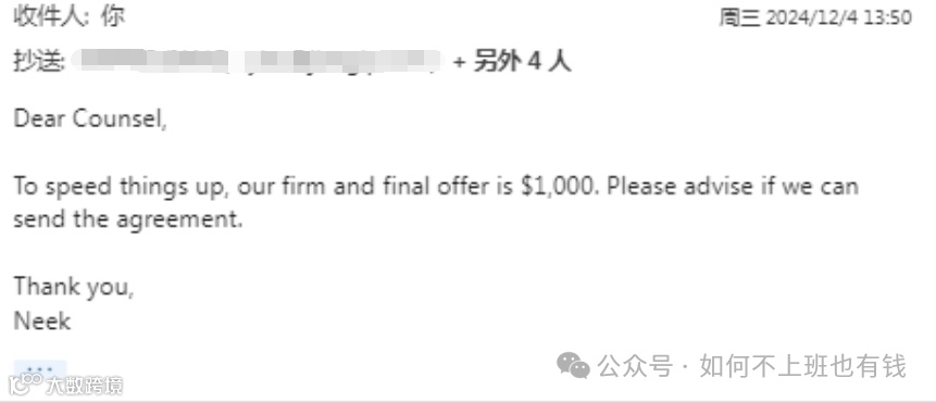 - 谈判最终阶段以原告回复“This is final and firm offer”为准,代表底价。