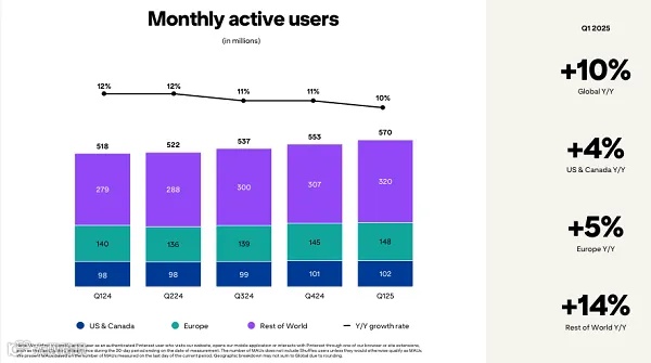 在收入方面,Pinterest 在2025年第一季度实现了8.55亿美元的收入,同比增长16%。与去年同期相比,这一增幅表现良好,尽管如此,Pinterest 仍需要在其他市场扩大广告业务,以进一步利用其用户基础。