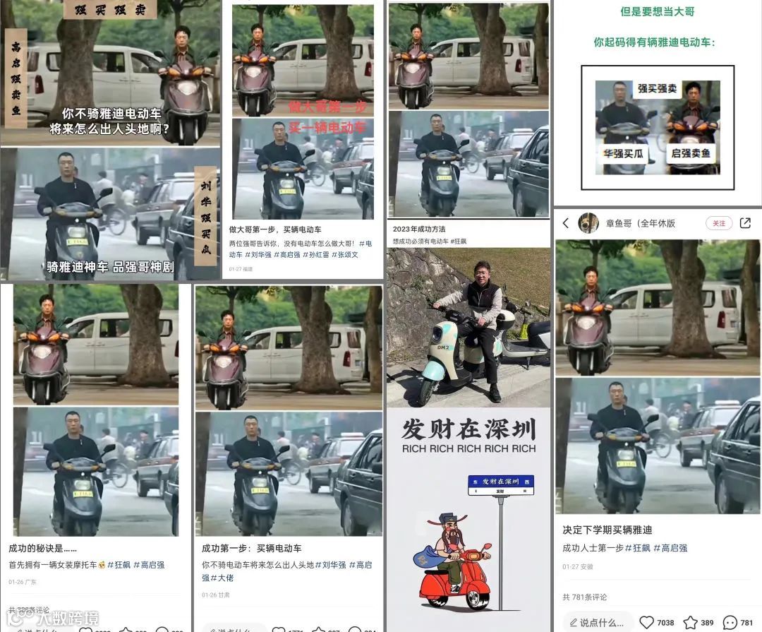 更是有不少网友联想到曾经的“黑道大哥”刘华强,也是靠一辆电动车闯天下,于是就有了“想要成为黑道大哥,你首先得有一辆雅迪电动车。”这也形成了病毒式的主动传播态势。