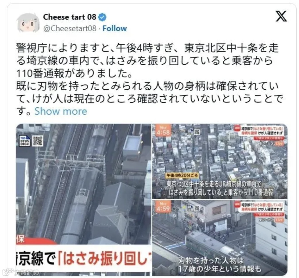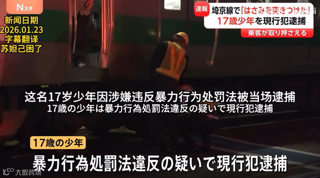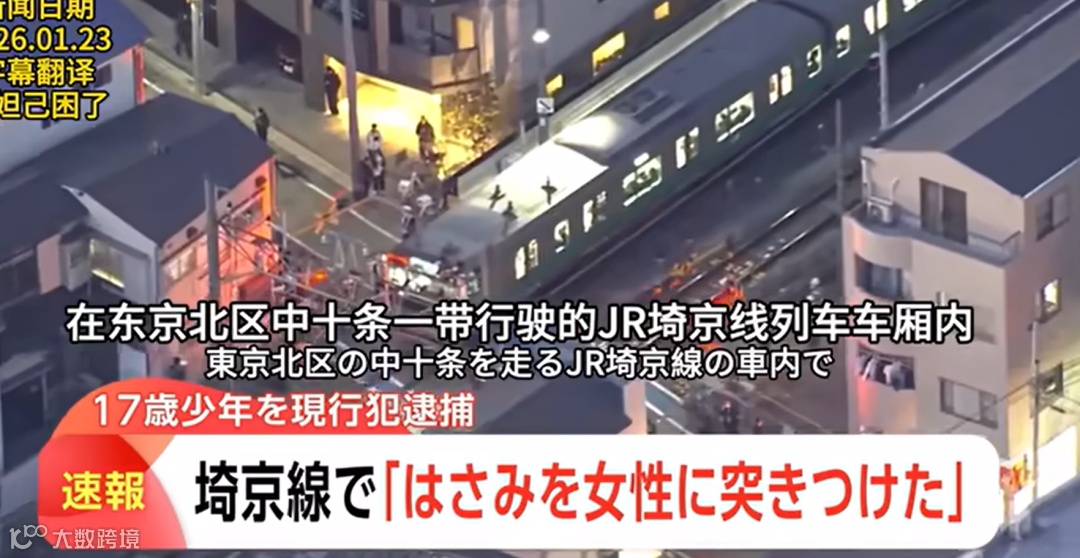23日下午,JR埼京线一列由埼玉县川口市开往东京都北区的普通电车在行驶至十条站与赤羽站之间时,一名17岁男性乘客在车厢中部挥舞剪刀并做出威胁动作,引发乘客恐慌。列车司机接报后立即启动紧急制动,列车停驶于区间内。