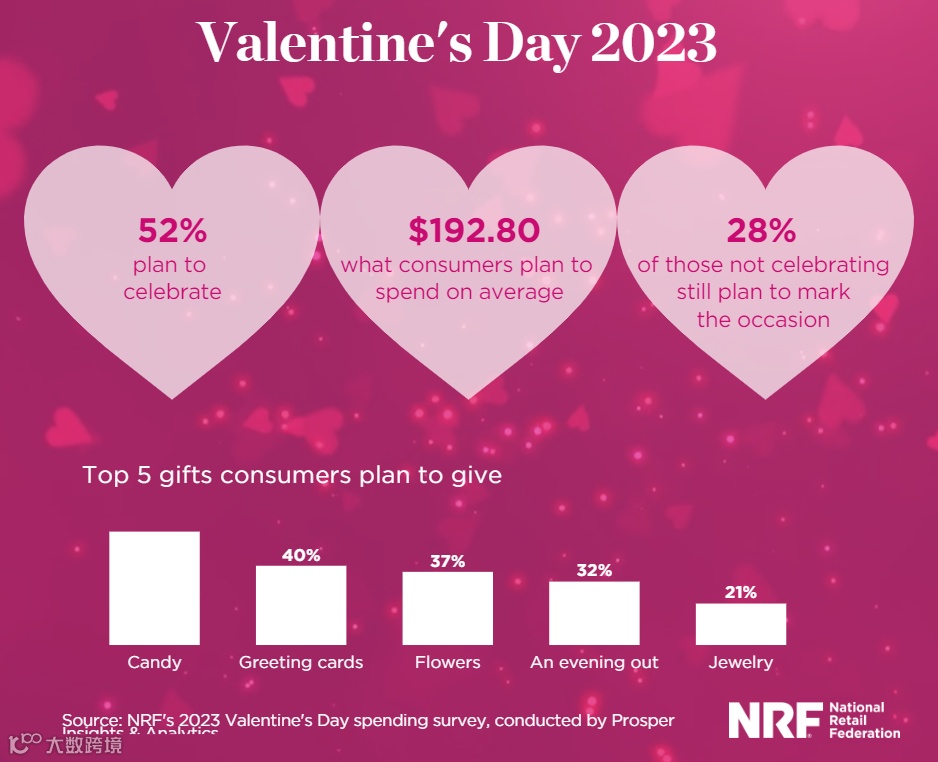 根据美国零售联合会(NRF)的一项年度调查,无论是赠送爱人心型巧克力,还是共度浪漫晚餐,有超过一半(52%)的美国消费者计划庆祝情人节,他们的平均花费为192.80美元,这高于2022年的175.41美元。