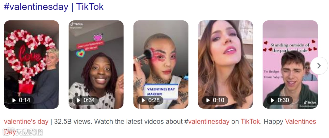 在TikTok上,自1月份开始,与#Valentinesday有关的话题浏览量就开始迅速上升,截至1月31日,标签#valentinesday视频浏览量达到325亿。