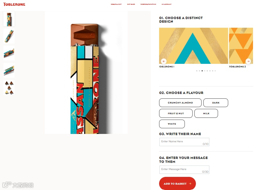 例如,瑞士三角巧克力Toblerone推出了2023情人节限量版粉色巧克力棒,并可定制个性化包装。在Toblerone网站,消费者可以自选包装风格、巧克力口味,还可以添加另一半的名字或昵称,写上给他们的话。