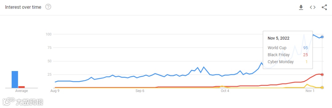 就在过去的一个月内,通过Google Trends 搜索指数显示发现目前大家对世界杯的关注度远超黑五和网一。这也成为各跨境人由此可趁机布局的商机。