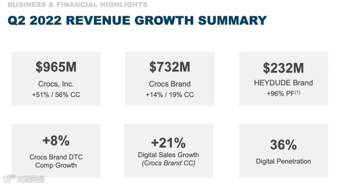 据2022年Crocs第二季度财务报告来看,第二季度营业收入达9.65亿美元,比市场预期增长近9.37亿美元,增长速度十分可观,预计将在2026年达到近50亿美元的销售额。