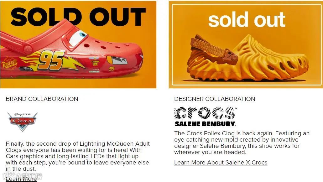 Crocs与迪士尼、宝可梦、哈利波特、星球大战、7—11便利店、Chinatown Maekrt、Carrots、KFC、贝玲妃、Vera Bradley等知名品牌合作,设计出无数双跨界联名款洞洞鞋。