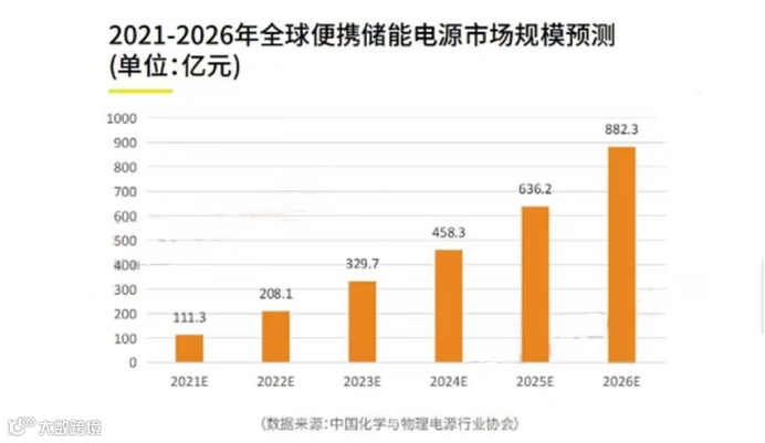 近年来,全球便携能源需求量不断攀升。据中国化学与物理电源行业协会数据显示,2021年全球便携储能电源市场达111.3亿元,预计2022年可达208.1亿元,到2026年可达8802.3亿元左右。