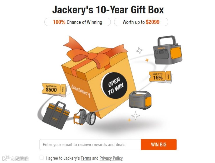 点进Jackery的instagram页面,即可看见“分享你的故事,赢取Jackery十年礼包”的活动;在官网主页出现优惠礼盒,点开即可看见“100%中奖”、“价值高达2099美元”等刺激消费者参与或购买的话语。