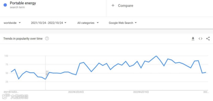 根据谷歌趋势,近一年来,谷歌关键词、YouTube搜索“Portable energy”,搜索热度一直持续不断,在今年7月该搜索热度达到最高峰值,相比较去年搜索热度翻了2倍。