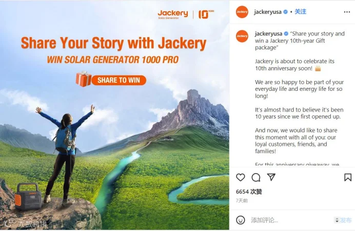海外消费者拥有强烈分享欲望,消费者购买后分享在社交媒体上,能为Jackery带来更多免费流量,吸引其他消费者购买。