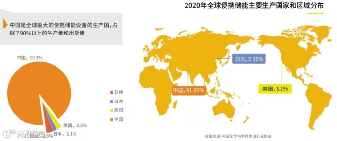 据中国化学与物理电源行业协会数据显示,2020年,中国便携储能设备生产量占比为91.9%,美国、日本分为占比3.2%、2.1%,中国是全球最大的便携储能生产国家,在生产便携能源的市场上,中国占据绝对出口优势。