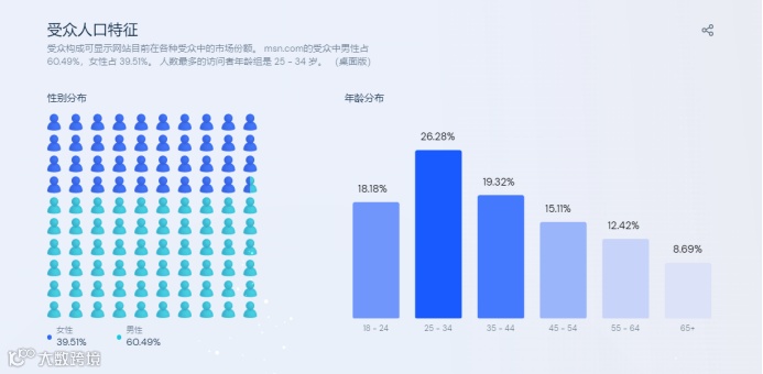 MSN的受众群体中,男性用户较多,占比60.49%,女性用户占比39.51%,年龄主要分布在25-34岁。