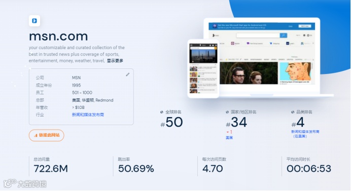 根据similarweb的数据,MSN的访问量达到了722.6M,2021年的广告年营收达到了10亿美金,在全美新闻和媒体发布商中排行第4。