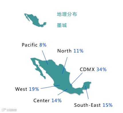 近年来,由于墨西哥人口极速增长,人口普遍比较年轻,网购主力军中大部分是25-34岁的青年人,其中女性消费者占到了53%。同时墨西哥网购的大本营大多集中在墨西哥城,大约占34%,位于墨西哥中部的墨西哥高原地区。