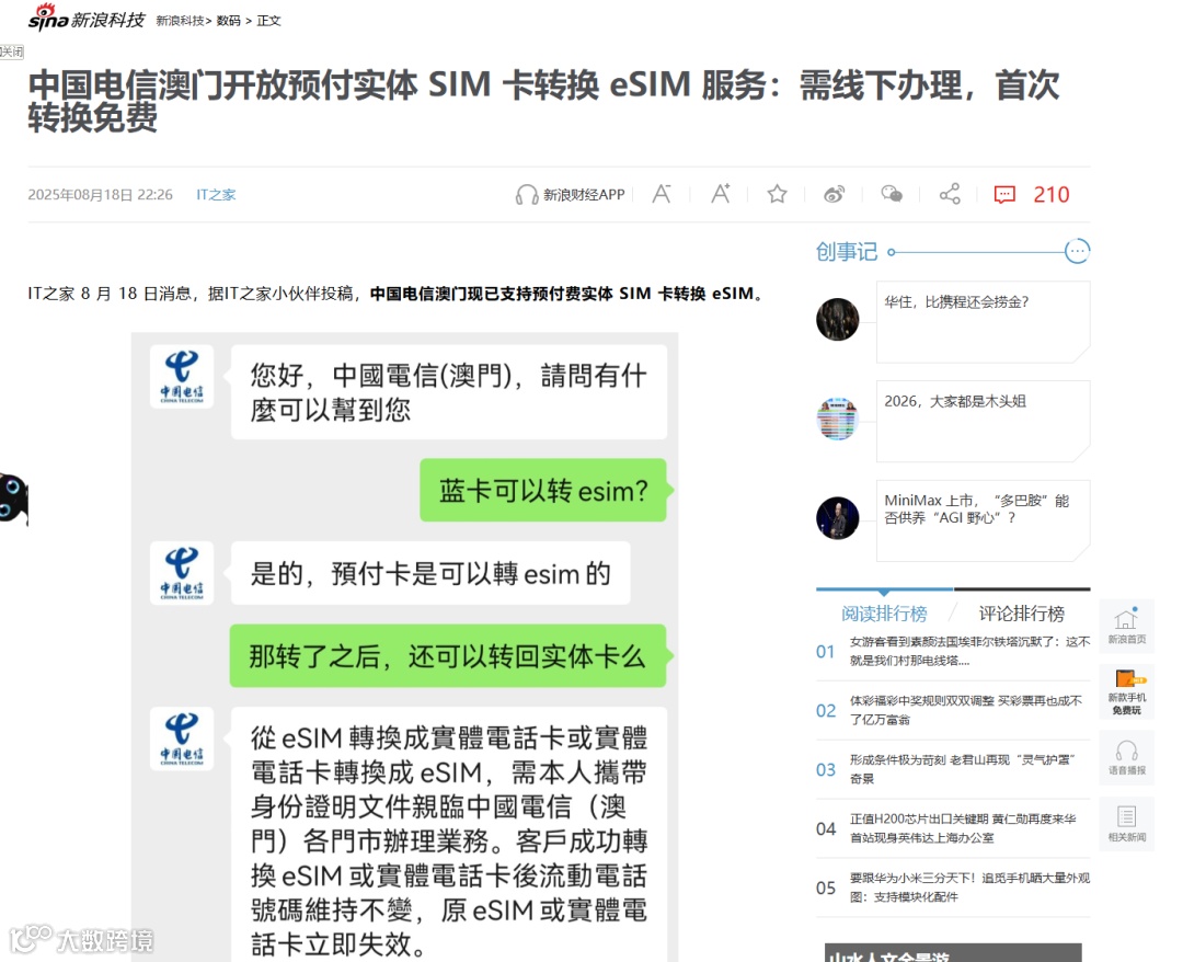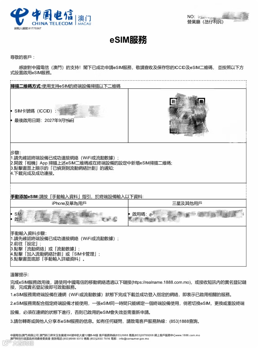 我们是国内较早推广使用海外电话卡实现合规跨境联网的团队。当前,中国电信澳门电话卡需本人抵达澳门后方可激活,已激活的卡片可继续正常使用。值得注意的是,中国电信澳门现已支持eSim服务,建议前往澳门时直接办理eSim,操作更便捷、体验更优。
