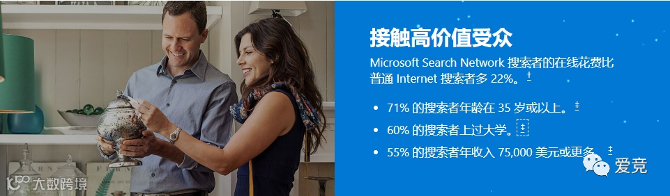 更好的投资回报率:l 来自再营销受众的点击次数增加了83%l 通过购物广告系列将CVR提高200%,同时将每次点击成本降低30%l Santa Barbara Chocolate的转化率提高了476%l 广告系列点击率提高了44%l 转化次数增加了236%l 转化率同比增长389%跨设备覆盖:随时随地在任何设备上与寻找您业务的客户联系。走向全球或本地:覆盖 Microsoft 搜索网络中的任何地方的人,或专注于距您的企业一定距离内的城市、县和地区。易于导入:如果您已经在使用 Google Ads 等其他产品,则可以轻松将该广告系列纳入 Microsoft Advertising。强大的多功能搜索工具:l 61%使用付费搜索来提高品牌认知度并增加购买意愿l 60%使用付费搜索来提高品牌知名度l 39%全球电子商务流量由搜索引荐