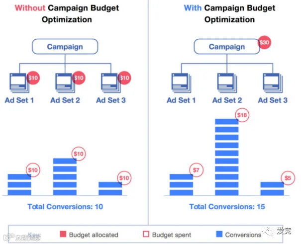 具体可以通过下面例子说明,左边没使用CBO,每日预算设置为30美元,3个广告组平均下来每个10美元,最后系列得到10次转化;右边使用CBO之后,Facebook自动将预算像表现好的广告组倾斜,最后得到了15次的转化。