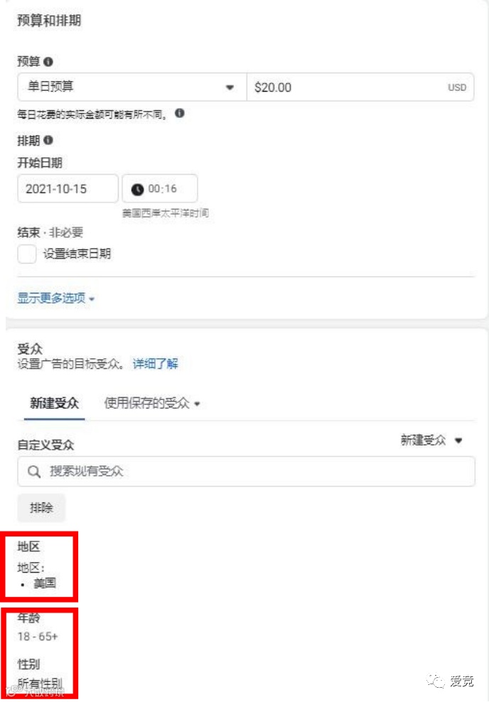 第三步,填写预算,可以设置排期,添加自定义受众,可以选择地区、年龄、性别、细分定位。选择归因设置,一般选择点击后七天。