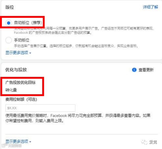 第四步,选择版位(一般设置自动版位),选择广告投放优化目标(转化量为例)
