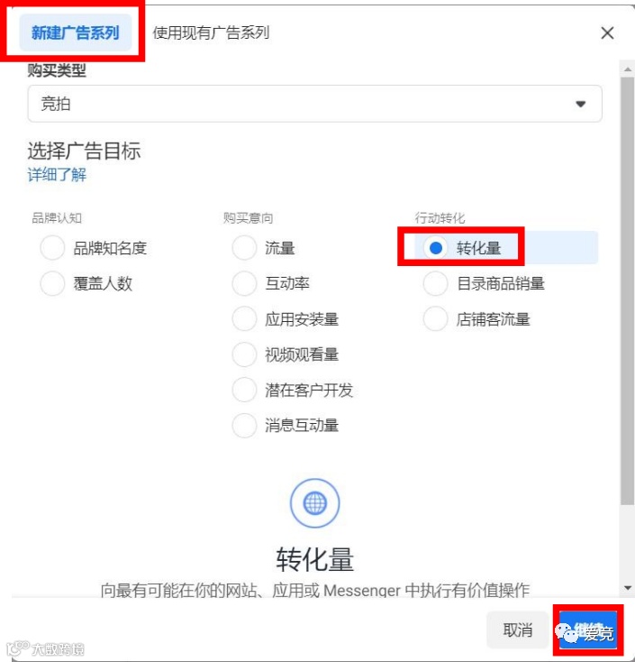 第一步,创建广告系列。在广告管理工具中,选择快速创建。为广告系列命名,营销目标选择转化量(以转化量为例)。