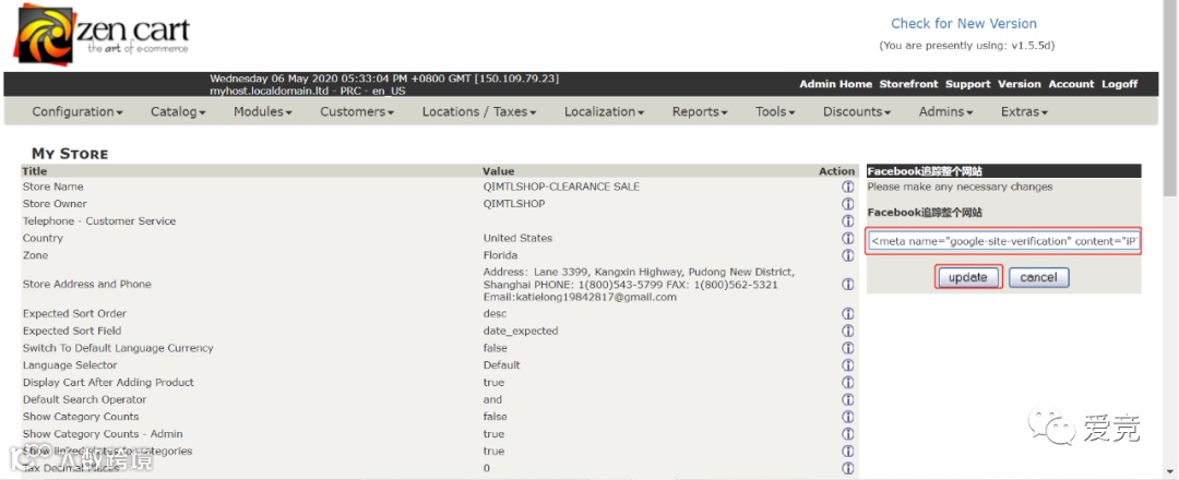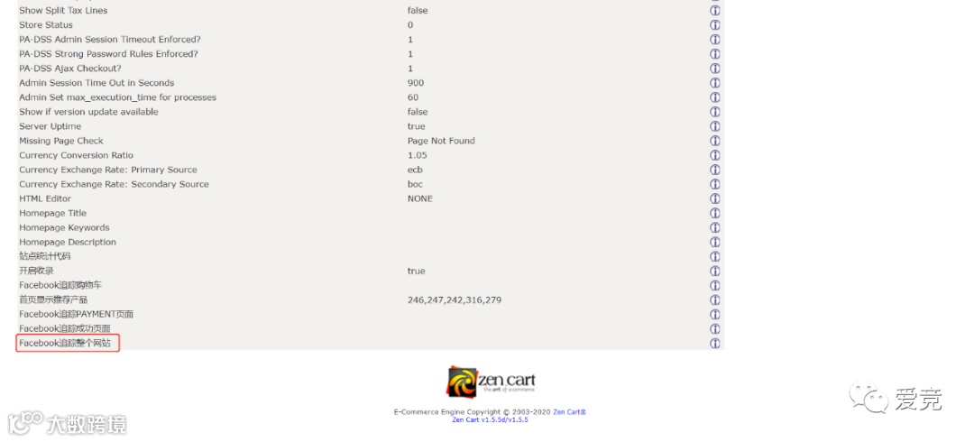 进入zencart网站后台,依次点击configuration-my store-facebook追踪整个网站,黏贴刚刚复制的代码