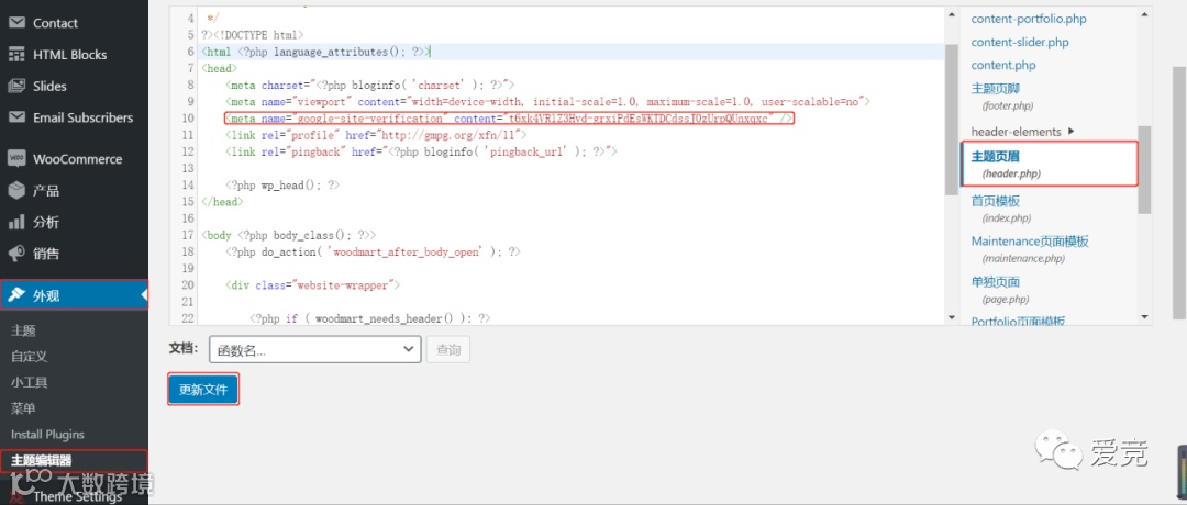进入wordpress的后台,依次点击外观-主题编辑器-主题页眉(header.php),将复制的代码黏贴至head中,点击更新文件。