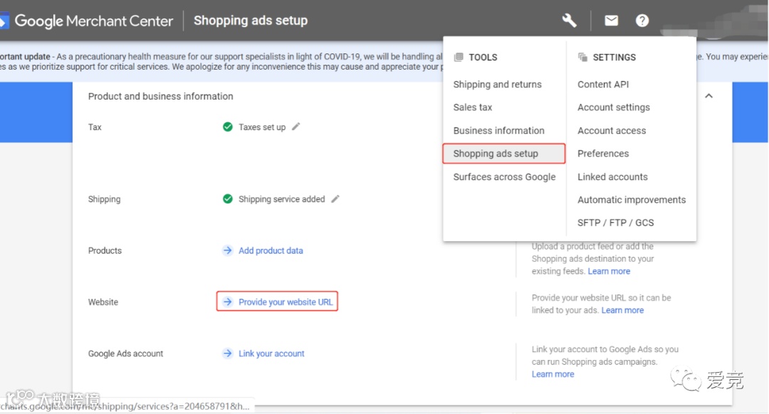 1、依次点击购物广告设置-提供您的网址-保存