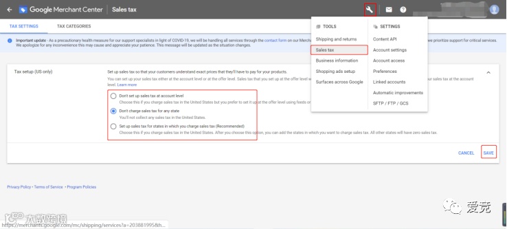 1、税费设置。依次点击设置(扳手)-销售税-选择您所需的一项(一般美国地区都选择为第二项--不针对任何州收取销售税)