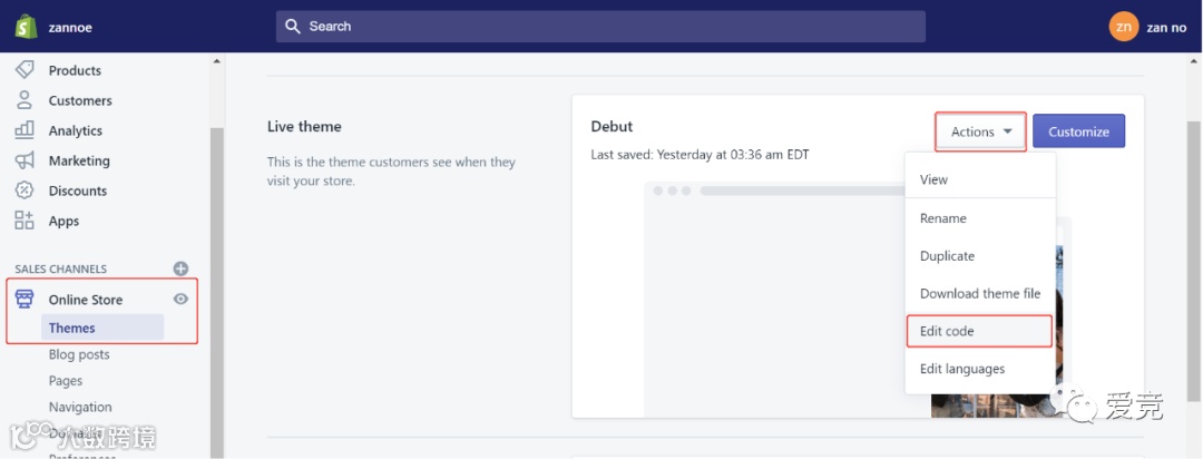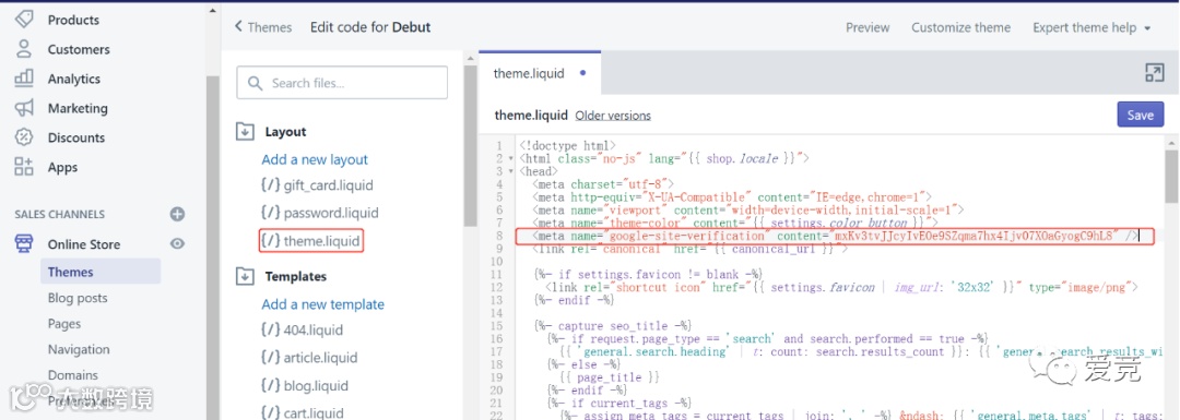 进入Shopify网站后台,依次点击online store-themes-actions-edit code-theme.liquid-黏贴刚刚复制的代码