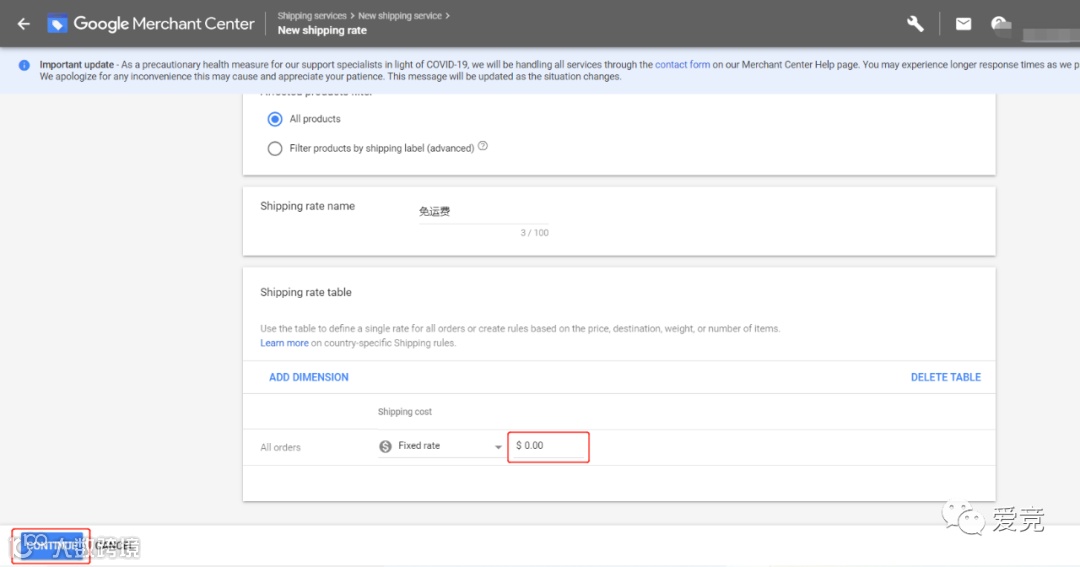 新增运费表,点击➕,输入运费名称,创建运费表格,输入费率,点击继续,点击保存。