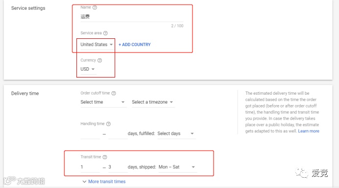 输入服务名称,选择服务区域。PS:请确保运费的币种与服务区域使用的币种一致。