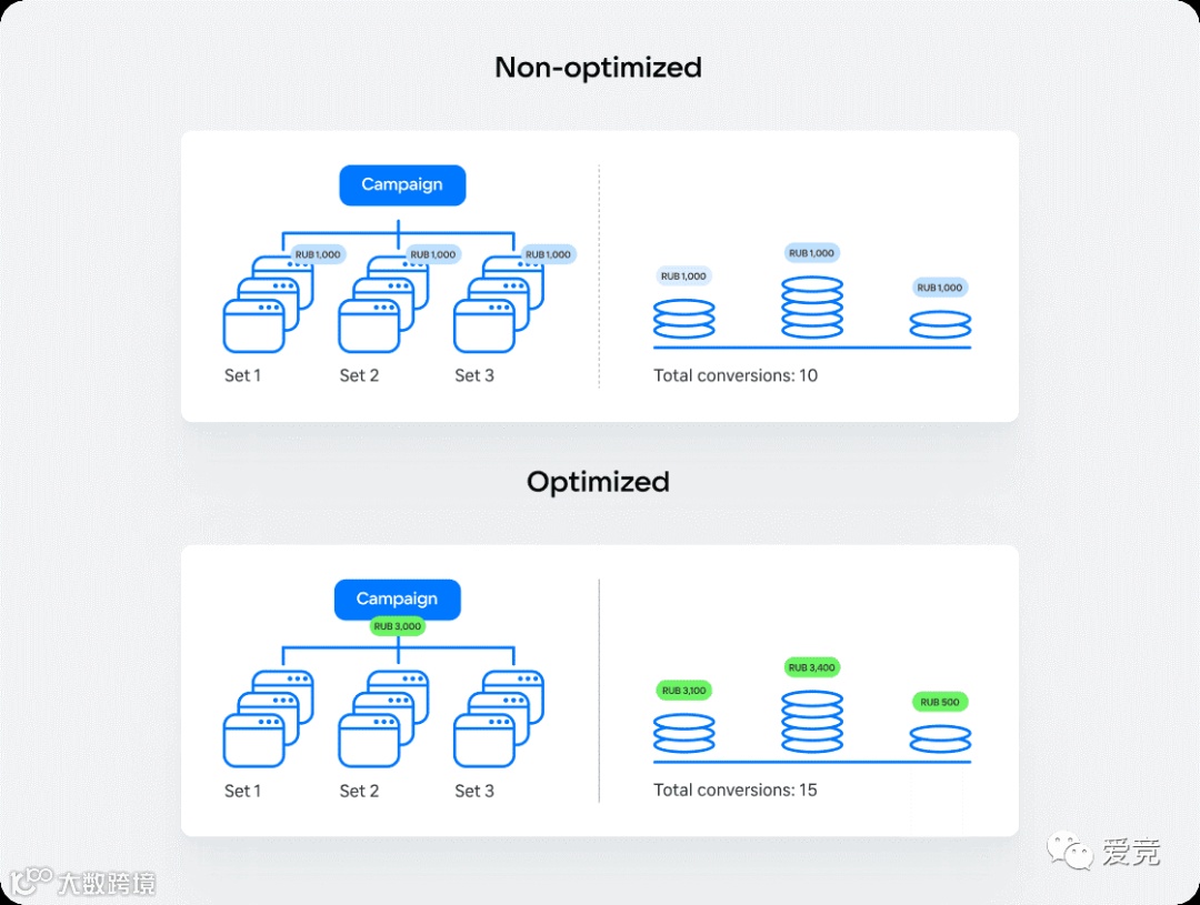 3.针对在广告竞争方面相反的受众或在广告集中使用不同的创意:广告活动预算优化没有考虑每个受众的出价密度。