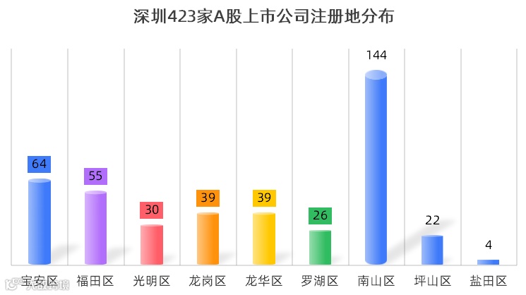 从注册地来看,南山区以144家公司位居榜首,代表企业有南玻A、沙河股份、深康佳A、深粮控股等;其次是宝安区,拥有64家企业,包括拓邦股份、怡亚通、诺普信、格林美等;福田区排名第三,共计55家公司,主要代表企业包括国华网安、全新好、深华发A和深科技。