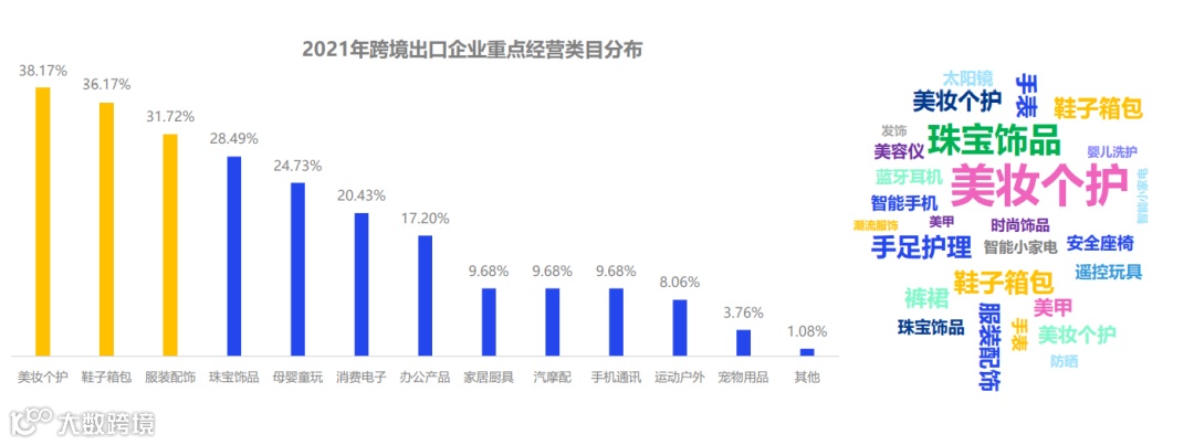 在受访的企业中,美妆个护、鞋子箱包和服装配饰等产品占比超过30%,是跨境电商出口的首选类目;珠宝饰品、母婴童玩及消费电子类产品占比超过20%。可见,当地消费者更愿意为“颜值”买单。