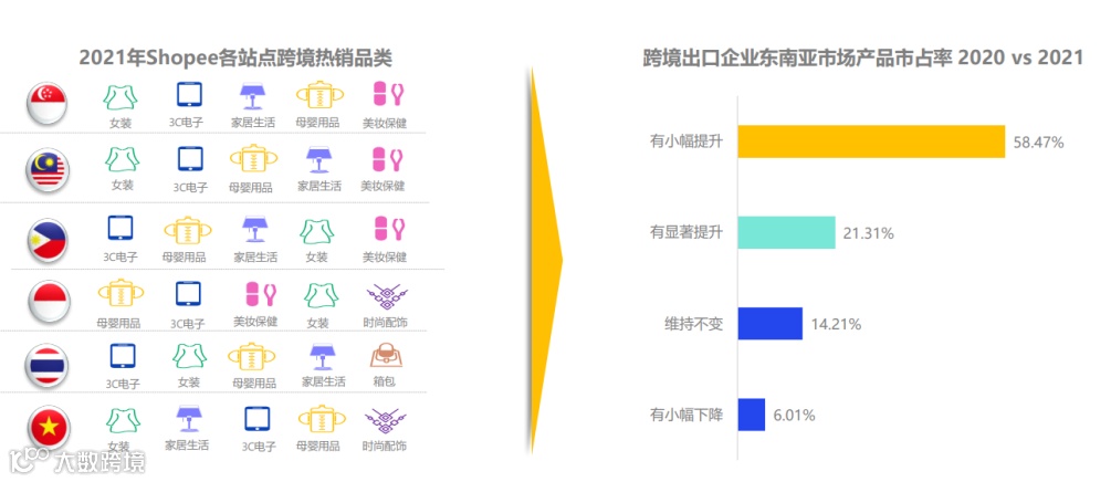 根据亿邦智库的调查,2021年有八成受访企业的跨境电商出口产品在东南亚的市场占有率同比提升。
