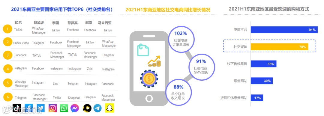 数据显示,2020 年东南亚社交电商市场规模已占电商市场总规模的 44%,而2021年上半年东南亚社交电商订单量同比增长102%,GMV增长了91%,平均每个订单收入增长88%。TikTok 、Facebook 、Instagram、WhatsAPP及Twitter等社交媒体纷纷加码构建或优化功能拓展电商业务提升用户体验。