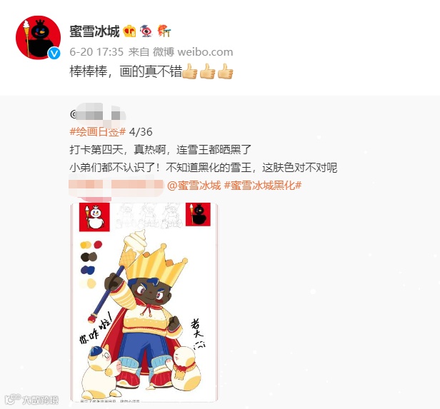 这时蜜雪冰城官方终于正式解释为何“黑化”:雪王去桑葚园摘桑葚被晒黑了,在“回应”的同时,也官宣了正在上线门店的新品桑葚果茶。至此,一场针对蜜雪冰城桑葚口味新品的营销行为终于水落石出。