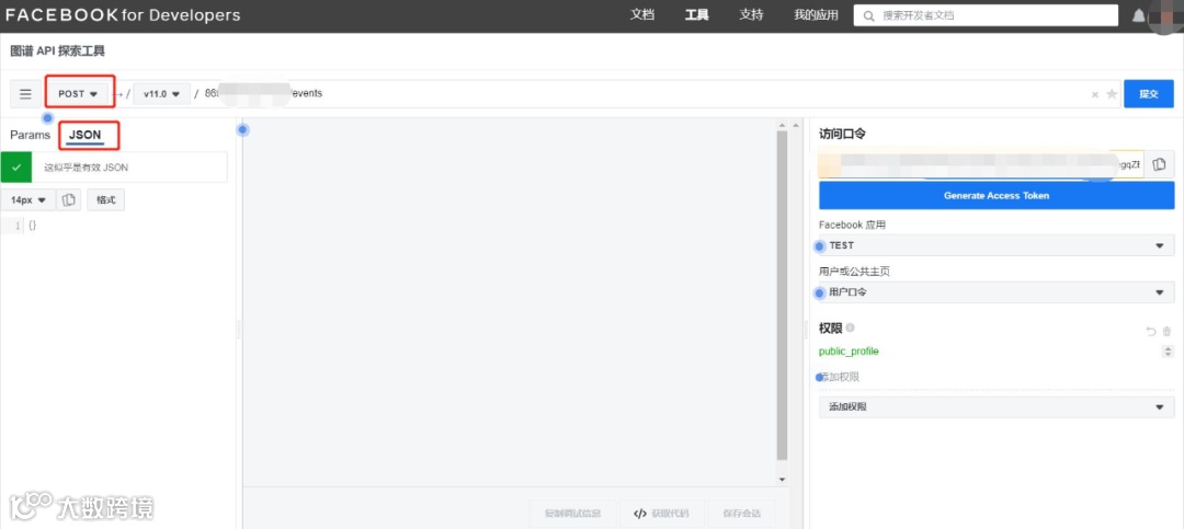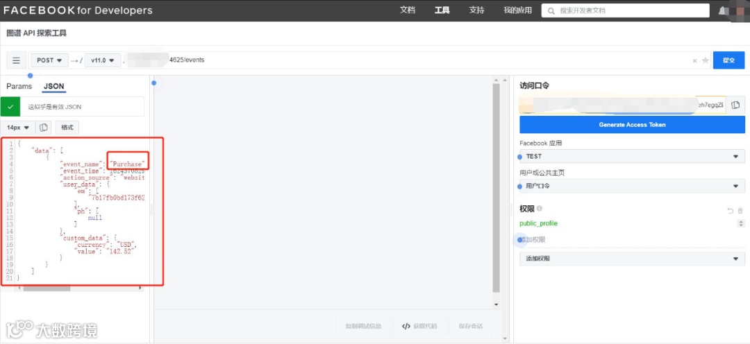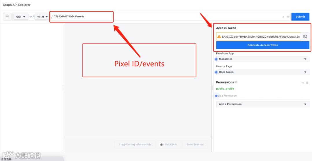 首先将复制的访问口令填写到“访问口令”选框,其次复制要配置的Pixel ID,将Pixel ID替换顶部文本框的内容“me?fields=id,name”之后,再输入“/events”,如下图所示