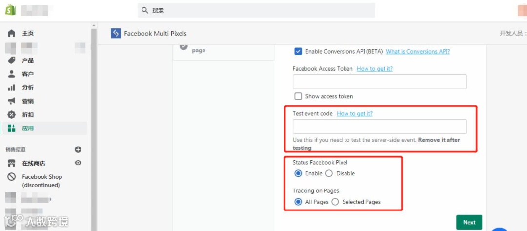 可使用Shopify自带的Facebook Channel进行连接。首先在Shopify左侧菜单的Sales Channels处添加Facebook作为销售渠道,选择Facebook Marketing,进行Facebook个人账户连接、BM连接、广告账户连接、主页连接,然后在Data sharing / tracking步骤选择Maximum栏位,并选择现有pixel进行连接,完成启动转化API。
