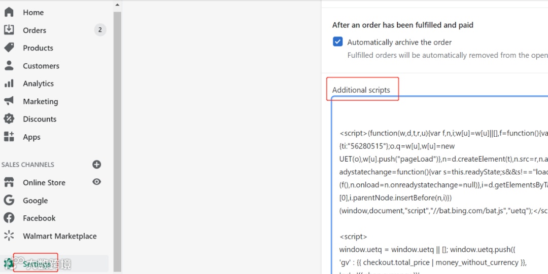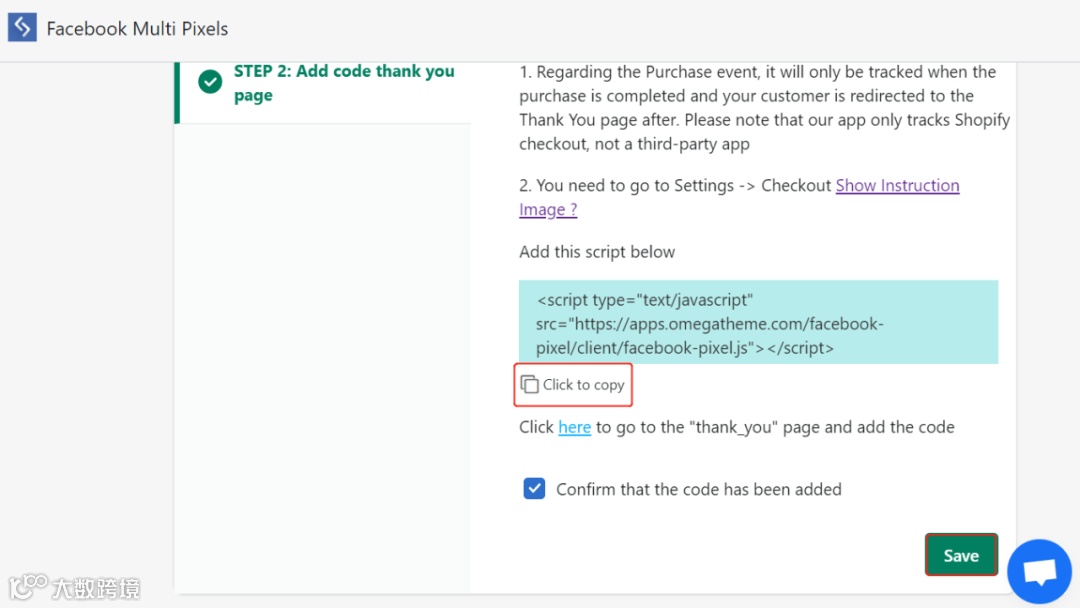 接下来给结账页面添加代码。复制代码,然后将这串代码添加到shopify后台的自定义脚本框将代码填写即可。Shopify后端设置 - 结账 - 下拉找到自定义脚本框,复制代码也可以。之后返回APP,点击确认代码已添加即可。